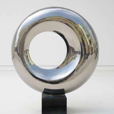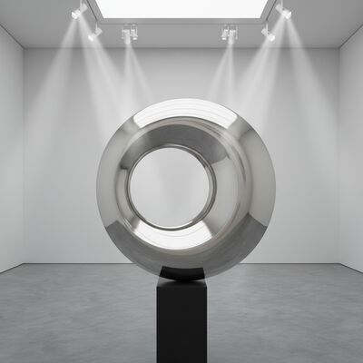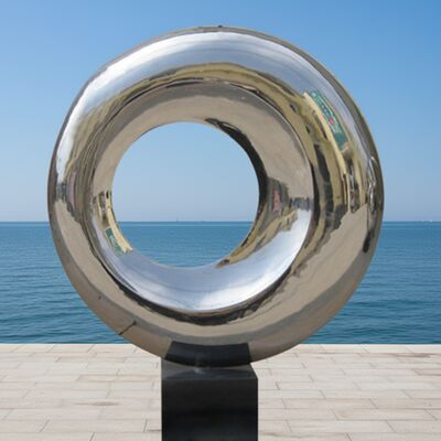 Tác phẩm nghệ thuật hiện đại bằng thép không gỉ này có bề mặt gương bóng cao nắm bắt ánh sáng và môi trường xung quanh, biến hình dạng tròn trừu tượng thành một điểm tập trung năng động cho bất kỳ không gian hiện đại nào.